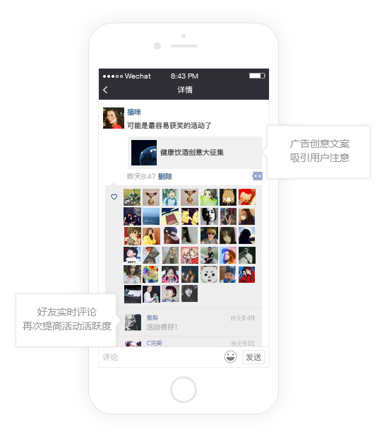 以朋友圈的原创内容形式展示在潜在用户群体圈子的广告形态